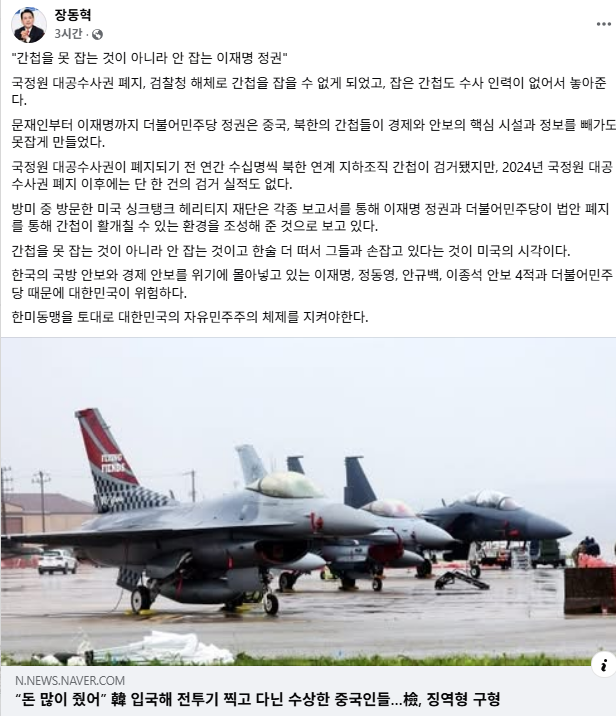 장 대표는 “헤리티지 재단은 각종 보고서를 통해 이재명 정권과 민주당이 법안 폐지를 통해 간첩이 활개 칠 수 있는 환경을 조성해 준 것으로 보고 있다”고 적었다.