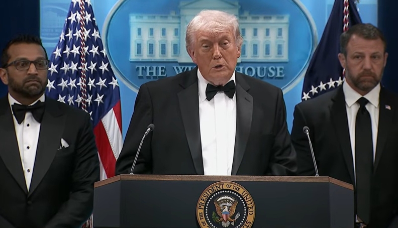 25일(현지시간) 미 현지 언론에 따르면, 트럼프 대통령은 이날 밤 총격 사건에서 용의자가 체포된 직후 기자회견을 열고 “(용의자가) 총기로 가까운 거리에서 발사했지만, 방탄 장비가 효과를 발휘했다”며 “용의자는 여러 개의 무기를 소지하고 보안검색대로 돌진했지만, 만찬장에 접근하기 전 제압됐다”고 말했다.