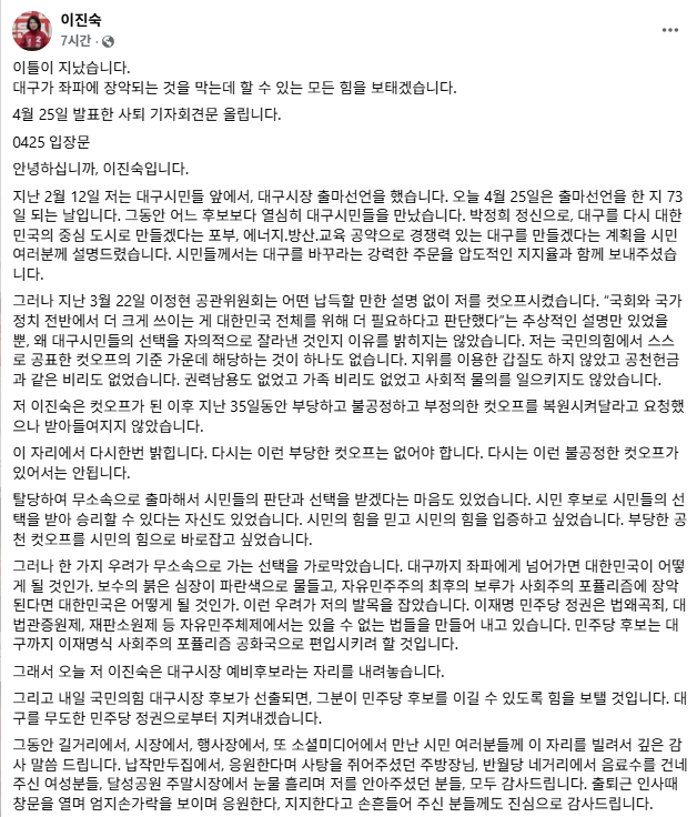 이 전 위원장은 지난 25일 입장문에서도 “그래서 오늘 저 이진숙은 대구시장 예비후보라는 자리를 내려놓습니다”라며 “그리고 내일 국민의힘 대구시장 후보가 선출되면, 그분이 민주당 후보를 이길 수 있도록 힘을 보탤 것입니다. 대구를 무도한 민주당 정권으로부터 지켜내겠습니다”라고 강조한 바 있다.