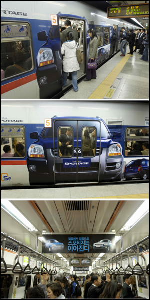 기아차는 일산까지 이어지는 3호전 지하철에 광고를 실시, 모터쇼 관람을 위해 일산 킨텍스로 향하는 시민들에게 이색적인 볼거리를 제공하는 것은 물론 광고 효과도 높아질 것으로 기대하고 있다.