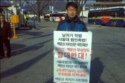 ◇광양시 공무원 노조위원장인 오모씨가 서울로 상경 서울대법인화법 불법시위에 버젓이 앞장서고 있어 주위의 눈총을 사고 있다. " 이럴려면 공무원 그만두고 전문시위꾼으로 나서야" 광양시 공무원들의 불법행위가 이만저만이 아니다. 정치적중립을 지켜야 할 공무원들이 사실상의 불법시위에 나선 것도 모자라 현행법을 무력화하는 데 앞장서고 있어 공안관계자들이 주목하고 있다. 전남 광양시공무원노조는 민간단체보다 더 앞장서 서울대학교 법인화를 공공연하게 반대하고 있다. 광양시청 입구에는 이들이 설치한 배너 현수막에 버젓이 '서울대법인화법' 반대 문구를 내걸고 있다. 지난해 국회를 통과하고 올해 시행령까지 제정된 서울대법인화법을 사실상 '무력화' 시키고 있는 것이다. 게다가 서울대가 관리하고 있는 백운산을 서울대에 넘기지 못하도록 각종 시위에 앞장서고 휴일에는 100여명의 공무원들을 동원해 상경시위까지 벌이는 등, 공무원으로서 도를 넘었다는 지적이다. 그들이 운영하는 공무원 노조게시판은 이들과 뜻을 같이하는 단체들의 홍보장으로 전락한 지 오래다. 최근에는 200여만이 넘는 돈을 조합공무원들의 사전 허락도 없이 '백운산지키기 시민행동' 이란 단체에 퍼주었다는 주장이 제기됐다. 광
