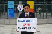 홍문종 새누리당 대표최고위원 후보는 오늘 19일(목) 오전 9시 서울행정법원 입구에서 전교조 법외노조 통보 취소소송 1심 판결을 앞두고 학부모들과 1인 릴레이 시위에 참가했다. 이 자리에서 홍 후보는 “지난 17일 진보성향인 교육감 당선자 13인 전원이 오는 7월 1일 임기도 시작되기 전부터 전교조의 법적 지위 상실을 막아달라며 탄원서를 제출한 것이 교육을 살리고 새로운 변화를 이루겠다던 당선자들의 첫 공약실천이냐”며 유감을 표명하고 “전교조 법외노조 문제는 불법에 대한 법의 심판이 분명히 필요하다”며 1인 시위 참여 이유를 설명했다. 계속해서 홍 후보는 더불어 “교육이 이념과 정치로 편이 갈라져 본질이 뒷전으로 밀려나고 있는 것이 안타깝다. 교사와 학생, 학부모가 함께 만들어가는 참된 교육 본연의 모습으로 돌아가 아이들이 행복한 대한민국이 되길 바란다”고 전했다. 박찬권 기자