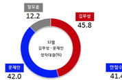 차기 보수진영 대권주자로 지목되고 있는 새누리당 김무성 대표의 지지율이 안철수 의원의 탈당으로 조금 하락했다. 이러한 가운데, 김 대표를 상대할 야권 후보로 새정치민주연합 문재인 대표와 무소속 안철수 의원의 지지율이 팽팽히 맞서고 있는 것으로 나타났다.여론조사 전문기관 리얼미터(대표: 이택수)가 실시한 12월 차기 대선주자 양자대결 지지도조사에서, 새누리당 김무성 대표는 45.8%, 새정치연합 문재인 대표가 42.0%를 기록했다.또, 이달 처음 실시한 김무성-안철수 양자대결에서는 김무성 대표가 42.2%, 안철수 의원이 41.4%로 두 주자가 오차범위 안에서 팽팽했다. 김무성 대표에 대한 문재인 대표와 안철수 의원 각각의 상대적 경쟁력을 비교하면, 대구•경북(문재인 26.5% vs안철수 20.2%)에서는 문재인 대표가 안철수 의원보다 상대적 우위를 점했고, 그 외 수도권(47.1% vs 45.6%), 대전•충청•세종(37.3% vs 42.2%), 부산•경남•울산(38.4% vs 38.8%), 광주•전라(45.1% vs 50.3%)에서는 오차범위 내에서 두 주자의 경쟁력이 비슷한 것으로 조사됐다.