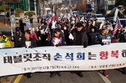 2018년은 더이상‘손석희의 저주’가 더 이상 통하지 않는 대한민국이 될 수 있을까?제 5차 JTBC 사옥 앞 집회가 2018년 새해를 맞아 신년제로 개최됐다. 4일 낮 12시, 서울 상암동 JTBC 사옥 앞에서는 ‘손석희 구속·박 대통령 무죄석방’ 신년제가 돼지머리 제삿상, 이순신 갑옷 등 다채로운 퍼포먼스와 함께 진행됐다. 이번 행사에는 변희재 대표고문, 조영환 올인코리아 대표, 신동욱 공화당 총재와 독자 200여명이 참석했다. 이날 무대에는 병풍, 제사상, 돼지머리, 대형 북 등이 준비돼 신년제 느낌이 물씬 풍겼다. 변희재 대표고문도 이순신 장군 복장을 갖추고 등장해 신년제 분위기를 한껏 끌어올렸다. 행사는 천신(天神)과 지신(地神)을 섬기는 퍼포먼스 등이 실시되며 실제 신년제처럼 연출됐다. 독자들은 새해 소원을 빌고 대형 북을 치기도 했다. 변 대표고문은 손 앵커의 구속이 새해 소망이라고 밝혔다. 그는 또 대형 백기에 한자로 ‘필승(必勝)’이라고 쓴 후 ‘우리는 반드시 이긴다’는 구호를 독자들과 함께 외쳤다. 이어 행사 참가자들은 상암동 DMC 근방을 행진하며 ‘손석희를 구속하라’는 목소리를 외쳤다. 이후 독자들의 노래자랑 시간을 마무리로 3시간에 걸