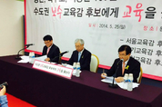조전혁 경기, 문용린 서울, 이본수 인천 교육감후보는 25일 "편향된 이념교육화된 수도권 교육을 되돌리기 위해 '선생님과 함께하는 교육개혁' 등 수도권지역 공동공약을 추진한다"고 발표했다.이들은 앞서 12일 '대한민국 올바른 교육감 추대위원회'로부터 시도교육감 보수단일후보로 추대된 바 있다.세 후보는 이날 서울시 서대문구 창천동 사루비아 빌딩에서 청년, 학부모, 직장인으로 구성된 100인의 시민, 도민 패널과 미래 교육발전 방향을 놓고 대화의 시간을 가진 뒤 수도권 지역 공동 공약으로 △수도권 교육안전 마스터 플랜 수립 △교육의 본질 바로세우기 △선생님과 함께 하는 행복교육 추진방안을 발표했다.세 후보는 "이번 세월호 참사를 통해 우리 사회가 겪고 있는 아픔을 치유하고, '안전한 대한민국'을 만들기 위해서는 수도권 교육이 앞장서야 한다"고 말했다.이를 위해 "경기, 서울, 인천지역을 하나로 묶어 어느 곳에서도 학생의 생명과 안전을 지키고, 쾌적한 환경에서 공부할 수 있도록 '경기-서울-인천 수도권 교육안전 마스터 플랜'을 추진키로 했다.세 후보는 이어 "교육의 본질을 바로 세우는데도 앞장서겠다"고 밝혔다.세 후보는 "수도권 교육이 대한민국 교육의 정체성과 본