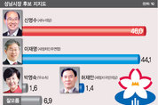 중부일보가 리얼미터에 의뢰해 지난 24일 하룻동안 실시한 성남시장 선거 여론조사 결과로 가 나왔다. 새누리당 신영수 후보(46.0%)와 새정치민주연합 이재명 후보(44.1%)가 1.9%p차 초박빙 접전을 벌이고 있는 것으로 나타났다. 새정치당 허재안 후보 1.4%, 무소속 박영숙 후보 1.6%, ‘잘 모르겠다’는 응답은 6.9%였다.‘반드시 투표하겠다’는 적극 투표 의향층에서는 신·이 두 후보의 지지율 격차가 5.5%p로 조금 더 벌어졌지만 오차범위를 벗어나지 못했다. 신 후보는 49.0%, 이 후보는 43.5%였다.지역별로 성남시 3개 구(區)중 분당구는 48.9% 대 43.1%로 신 후보가, 수정구는 41.7%대 47.1%로 이 후보가 우세했다. 중원구는 신 후보 44.6%, 이 후보 43.2%로 팽팽했다.연령별로 신 후보는 20대(51.3% 대 38.3%)), 50대(53.9% 대 36.9%)), 60대 이상(60.9% 대 30.6%))에서, 이 후보는 30대(54.4% 대 33.0%), 40대(56.3% 대 34.9%)에서 강세를 보였다.이번 조사는 성남지역 유권자 700명을 대상으로 유선전화 RDD(임의번호걸기) 자동응답전화조사 방식으로 실시됐다.