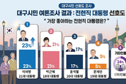 인싸잇=한민철 편집국장 | 대구광역시 유권자를 대상으로 진행한 전·현직 대통령에 대한 호감도 조사에서 이재명 대통령이 박근혜·윤석열·문재인 전 대통령보다 높은 결과를 기록했다. 경기지역 언론매체 <인싸잇경기>가 한국여론평판연구소(KOPRA)에 의뢰해 지난 6~7일 대구광역시 거주 만 18세 이상 남녀 1012명을 대상으로 실시한 “전·현직 대통령 중 가장 좋아하는 사람은 누구입니까”라는 질문의 조사 결과, 응답자의 23%가 이재명 현 대통령을 답했다. 이어 박근혜 전 대통령(21%), 윤석열 전 대통령(17%), 문재인 전 대통령(5%) 순이었다. 기타인물에 대한 응답은 24%이며, “없다”는 응답률은 9%에 달했다. 연령대별로 살펴보면, 18~29세, 60대와 70세 이상을 제외하고 나머지 연령층에서 이재명 대통령에 대한 호감도가 가장 높았다. 먼저 18~29세에서 가장 높은 호감도는 윤석열 전 대통령(21%)이었다. 이어 이재명 대통령(17%), 박근혜 전 대통령(9%), 문재인 전 대통령(6%) 순이었다. 30대에서는 이재명 대통령 22%, 윤석열 전 대통령 19%, 박근혜 전 대통령 14%에 문재인 전 대통령 7%였다. 40대는 이재명 대통